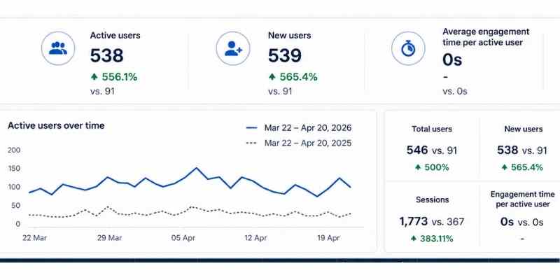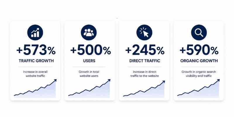 Active users grew by more than 550%. New users increased by over 560%. Overall website traffic rose by approximately 500%, with engagement events up by more than 380%.